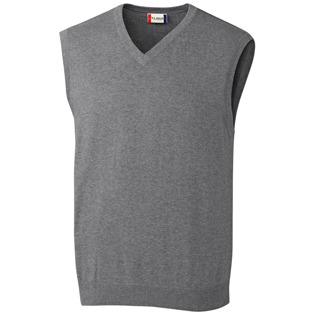 Surprise the members of your company team by giving away the popular Clique Men's Charcoal Melange Imatra V-neck Sweater Vest. Wear the 100% cotton sweater vest over a button down dress shirt to convey your sense of fine fashion taste. You will also look sharp wearing the chic company apparel over a Clique polo. Ribbing detail at the hem exudes panache, while 12-guage jersey stitch resists the types of fraying that diminishes the quality of other styles of sweater vests. Attach your corporate logo on the embroidery area to reach more potential customers in the community.Highlights