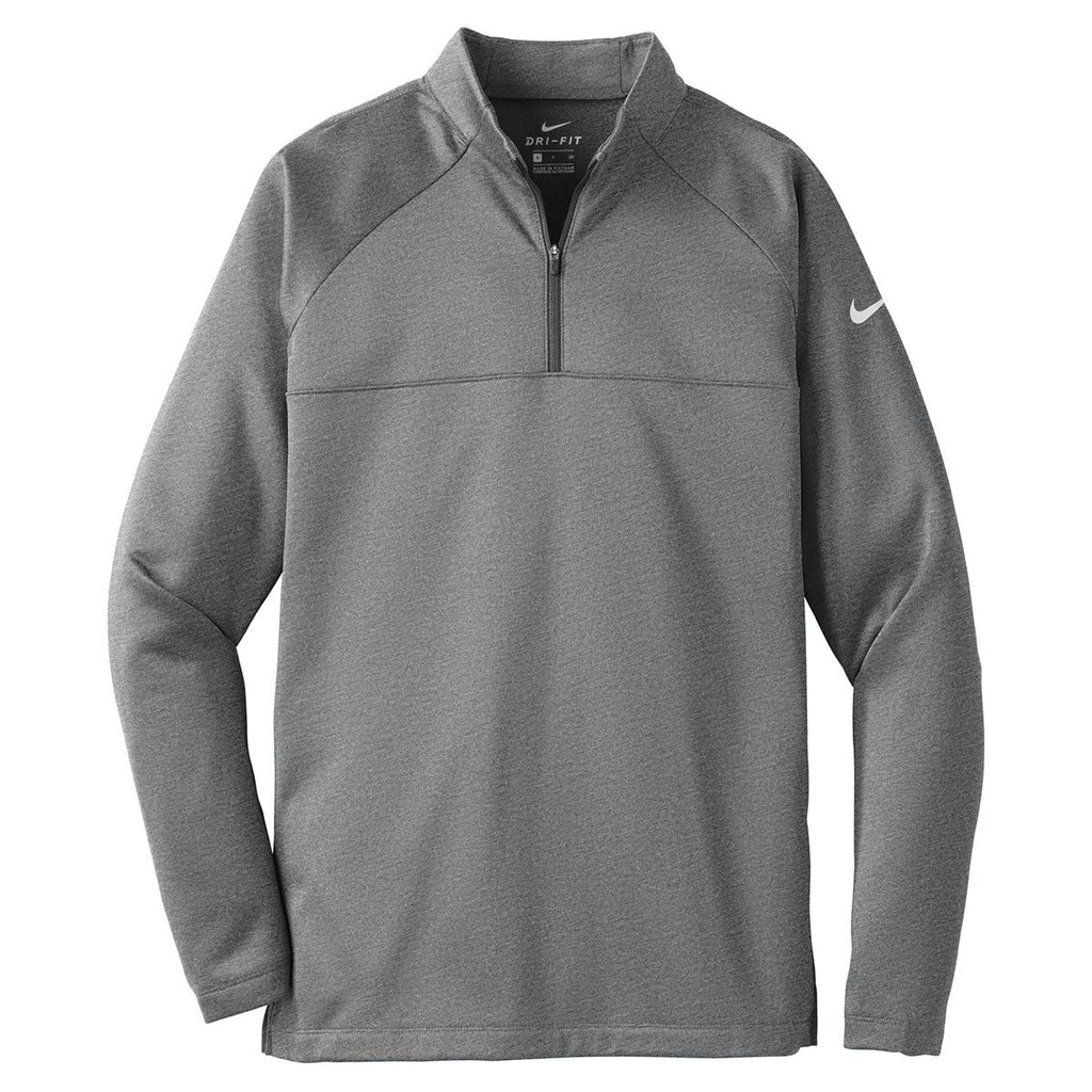 At the next corporate job fair, hand out company logoed Nike Men's Dark Grey Heather/Dark Grey Heather Therma-FIT 1/2-Zip Fleece to make a strong positive impression on candidates. You not only build goodwill with potential new employees, you also create a platform for promoting your company at industry trade shows. The large imprint area is the ultimate place to attach a custom logo. Durable polyester withstands frequent use to give you go to all-season apparel for years to come. The moisture management feature complements proprietary Therma-FIT technology that ensures you enjoy optimal warmth. Wear the half-zip fleece to work and keep it on afterwards when you take the bike out for a spin.Highlights