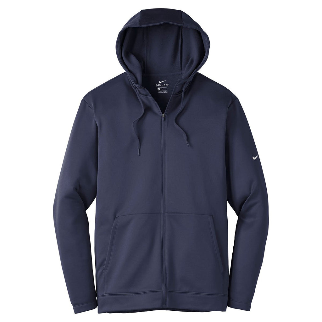 Unite the corporate team before the next big project by giving away the logoed Nike Men's Midnight Navy Therma-FIT Full-Zip Fleece Hoodie. Nike developed Therma-FIT technology to trap body heat, which makes the fleece hoodie perfect for active professionals that love to downhill and cross country ski. Moisture management properties allow you to push it to the limit and not have to worry about the discomfort caused by an abundance of moisture. Thumbholes increase the fabric coverage around the hands. Add your company logo on the large imprint area and watch your brand reach new marketing heights.Corresponding Women's Style:Nike Women's Midnight Navy Therma-FIT Full-Zip Fleece Hoodie