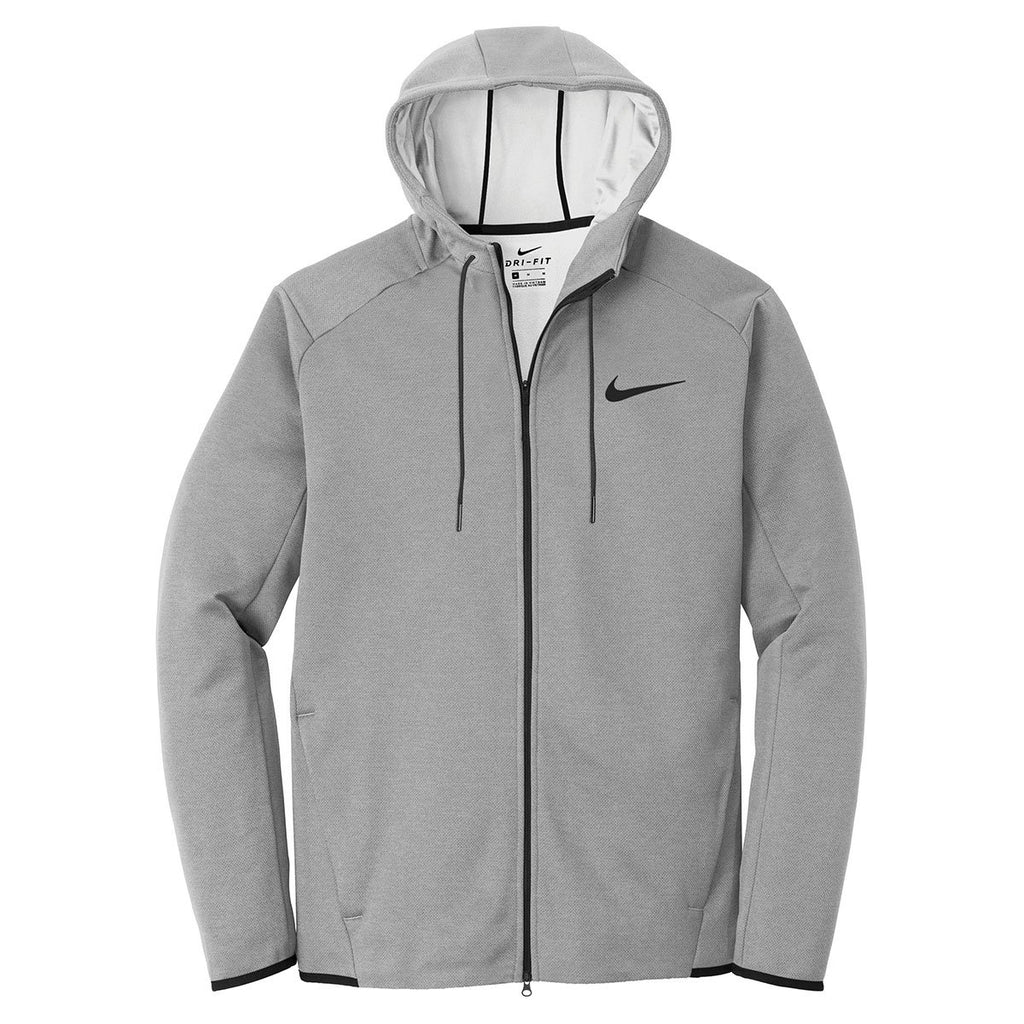 Build team unity by ordering the logoed Nike Men's Grey Therma-FIT Textured Fleece Full-Zip Hoodie. The stylish hoodie works great as a warm up jacket before the big corporate race for charity. Thick polyester prevents cold air from prematurely ending your fun day outdoors. The rip and tear resistant jacket gives your team go to corporate apparel that lasts for years. Add a custom logo on the large imprint area to reach more potential customers at civic events. Adjust the draw cord to achieve the most comfortable fit for the hood. Elastic trim at the cuffs provides more room to move your hands.Highlights