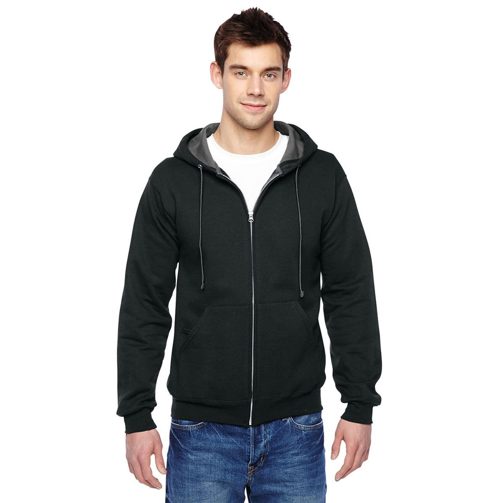 Fruit of the Loom Men's Black 7.2 oz SofSpun Full-Zip Hooded Sweatshirt with a custom embroidery of your company logo would make for an impressive addition to your employee apparel. Made of a cotton and polyester blend and available in 14 various colors this full-zip sweatshirt is great for layering when running errands or to stay warm while practicing for the next big golf event. A front media pocket and side pockets allow for easy carrying of small necessary items no matter what activity you choose. Order several for the next trade show and leave a real impression with your company logo sweatshirts.Highlights