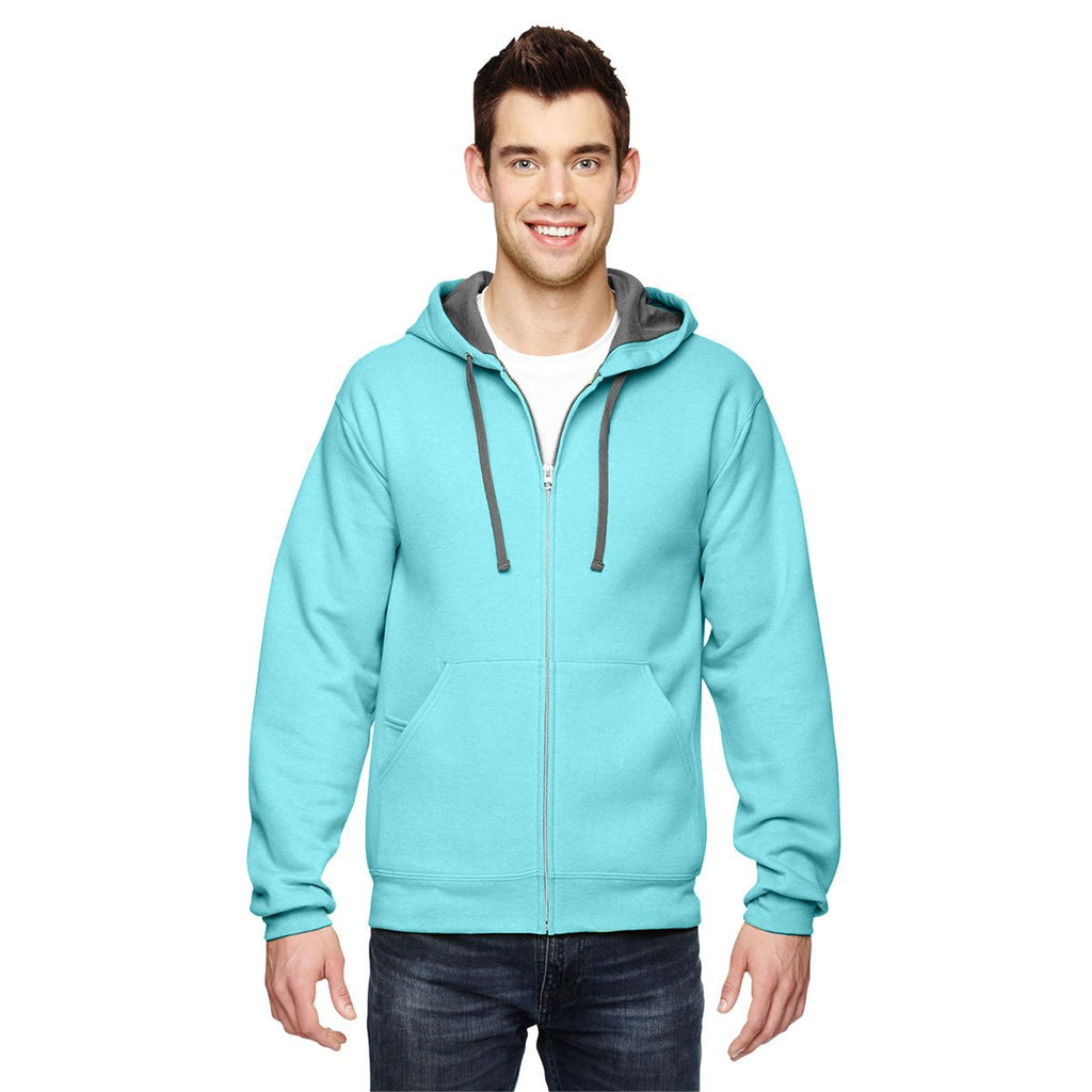 Fruit of the Loom Men's Scuba Blue 7.2 oz SofSpun Full-Zip Hooded Sweatshirt with a custom embroidery of your company logo would make for an impressive addition to your employee apparel. Made of a cotton and polyester blend and available in 14 various colors this full-zip sweatshirt is great for layering when running errands or to stay warm while practicing for the next big golf event. A front media pocket and side pockets allow for easy carrying of small necessary items no matter what activity you choose. Order several for the next trade show and leave a real impression with your company logo sweatshirts.Highlights