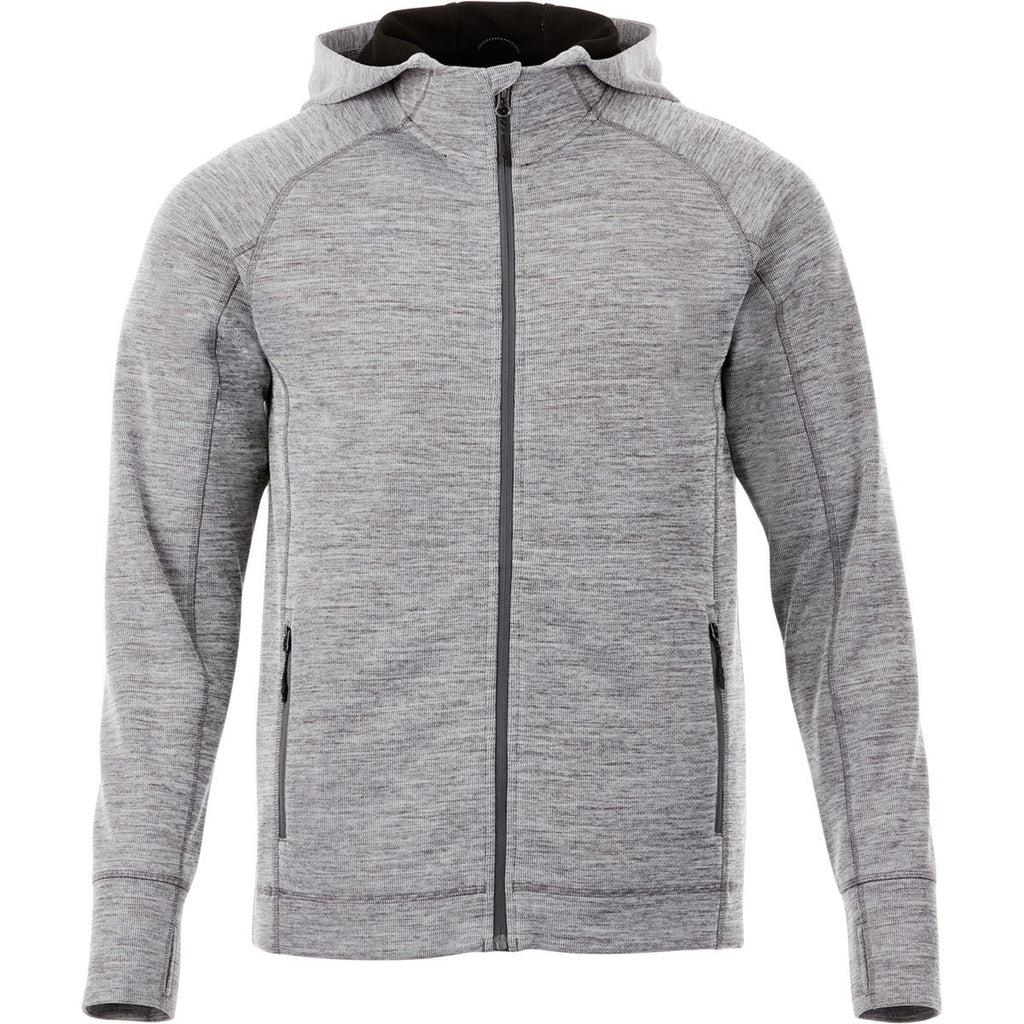 Who doesn't love a hoody? The Elevate Men's Heather Charcoal Odell Knit Zip Hoody is no exception. Perfectly priced for the moisture wicking finish and complete with sleeve cuffs, thumb exits, and interior earbud guide and exit port, this hoody has it all. Add a bit more with a custom logo to show off during cold weather jogs or outdoor activities. Available in maroon, invictus, and charcoal heather or black, this polyester sweater double knit is full zip for easy on and off. A great corporate gift or something to use as employee apparel the full zip hoody goes from the gym to the office with ease. Design your logo and order today!Corresponding Women's Style:Elevate Women's Heather Charcoal Odell Knit Zip Hoody