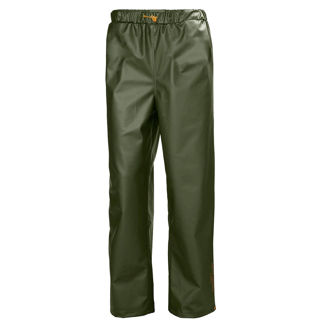 Let the rain not disrupt you from reaching your company goals with this customizable Helly Hansen Men's Army Green Gale Rain Pant. No job is too tough for this durable and ergonomic workwear waterproof pant designed with an elastic waist for a comfy fit. Its metal snap fastener prevents water from getting in while moisture-wicking knit lining wicks away sweat and eliminates stickiness. 4-way stretch fabric allows freedom of movement, but still strong enough for medium duty work. The outer PVC coating ensures maximum waterproofing and withstands stretching as well as wear and tear. These customizable waterproof rain pants are perfect for days when the wet weather strikes. Useful for commercial fishing industry and other similar businesses.
