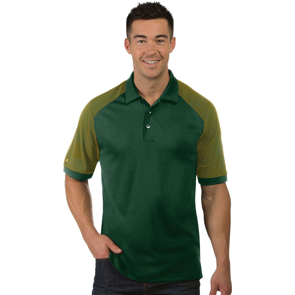 Make a statement with Antigua Men's Dark Pine/Gold Engage two-toned, polyester with Desert Dry moisture wicking jersey. The yarn dye mini-stripe on the sleeves and top shoulder add just a bit of extra to this already impressive look. Add a custom logo to the color(s) of your choice and use these shirts as employee apparel or gifts for the next recruiting event. Stylish and professional enough to wear as corporate apparel, the self-fabric collar, 3 button placket, and Antigua's triangle patch on the right sleeve will have you looking and feeling your best no matter the environment. Create your custom design and place an order today.Highlights