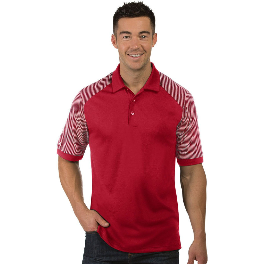 Make a statement with Antigua Men's Cardinal Red/White Engage two-toned, polyester with Desert Dry moisture wicking jersey. The yarn dye mini-stripe on the sleeves and top shoulder add just a bit of extra to this already impressive look. Add a custom logo to the color(s) of your choice and use these shirts as employee apparel or gifts for the next recruiting event. Stylish and professional enough to wear as corporate apparel, the self-fabric collar, 3 button placket, and Antigua's triangle patch on the right sleeve will have you looking and feeling your best no matter the environment. Create your custom design and place an order today.Highlights