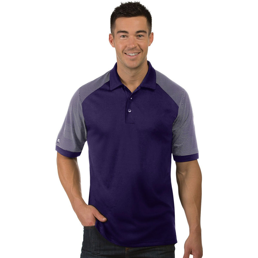 Make a statement with Antigua Men's Dark Purple/White Engage two-toned, polyester with Desert Dry moisture wicking jersey. The yarn dye mini-stripe on the sleeves and top shoulder add just a bit of extra to this already impressive look. Add a custom logo to the color(s) of your choice and use these shirts as employee apparel or gifts for the next recruiting event. Stylish and professional enough to wear as corporate apparel, the self-fabric collar, 3 button placket, and Antigua's triangle patch on the right sleeve will have you looking and feeling your best no matter the environment. Create your custom design and place an order today.Highlights