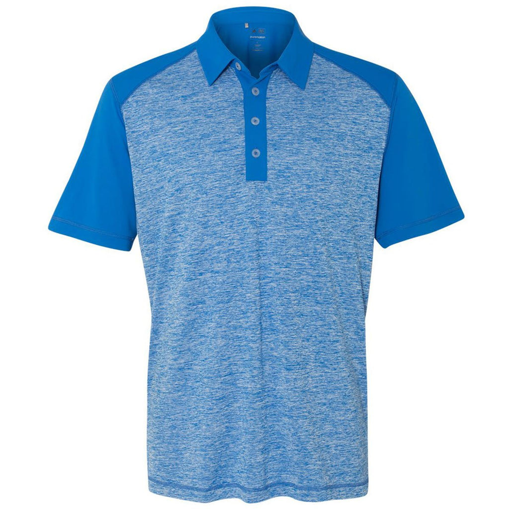 Show your softer side with the Adidas Golf Men's Bright Royal Heather/Bright Royal Heather Block Sport Shirt in four heather finish combinations. The polyester sport shirt offers a heathered front and back with contrasting sleeves, shoulder, placket and collar. A little flair for this custom Adidas creation. Add a company logo to wear as part of the next golf event or a custom embroidery to use as employee apparel at the next trade show. These make perfect giveaways or gifts at a recruiting show for top candidates that need to remember your company name. Choose your color combo and logo to place an order today.Corresponding Women's Style:Adidas Golf Women's Bright Royal Heather/Bright Royal Heather Block Sport Shirt
