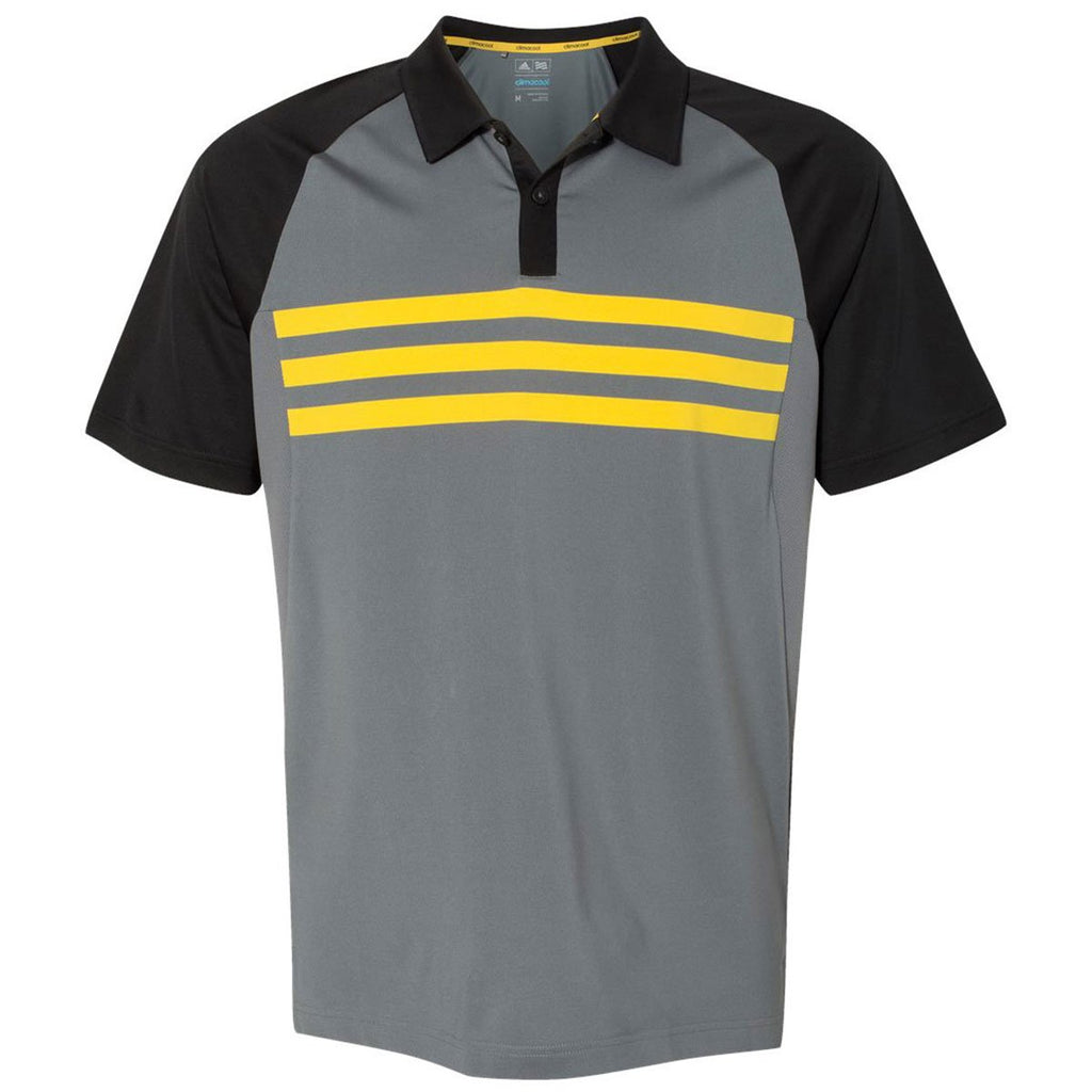Show your sporty side with the Adidas Golf Men's Black/Vista Grey/EQT Yellow Climacool 3-Stripe Sport Shirt in several striped combinations. The polyester sport shirt offers a two-button placket, self collar, and raglan sleeves with Underarm Climacool inserts. A little flair for this custom Adidas creation is found with the 3-stripes on the chest in a contrasting color to match the Adidas logo on the back neck. Add a company logo to wear as part of the next golf event or a custom embroidery to use as employee apparel at the next trade show. These make perfect giveaways or gifts at a recruiting show for top candidates that need to remember your company name. Choose your color combo and logo to place an order today.Highlights