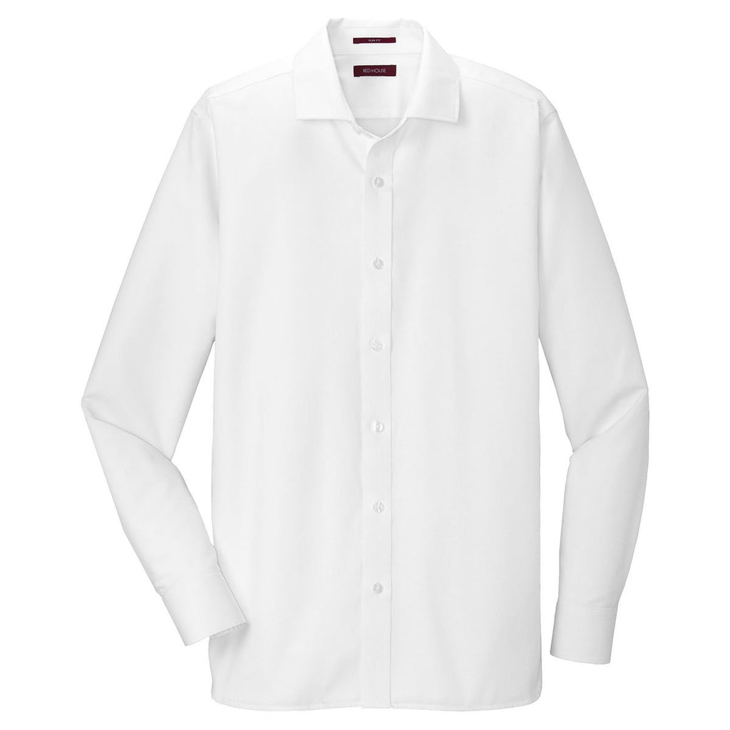 Companies in search of the perfect uniform for the hard working professionals that finalize sales deals in the field should order the embroidered Red House Men's White Slim Fit Nailhead Non-Iron Shirt. Simply wash and dry the stylish shirt and enjoy a wrinkle free appearance that never requires the use of an iron. The super comfortable silk-like feel of the corporate shirt keeps your team feeling fresh throughout long work days. Polyester blended with soft cotton resists rips and tears to make the apparel the best choice for professionals that get their hands dirty on the job. Add your company logo to create walking billboards for your brand.Corresponding Women's Style: Red House Women's White 3/4-Sleeve Nailhead Non-Iron Shirt