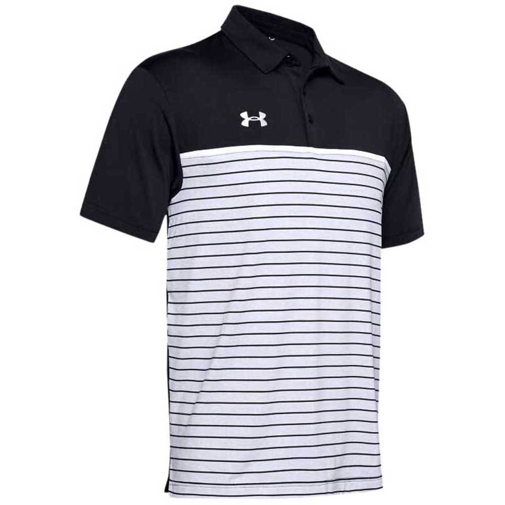 Keep things fresh with an embroidery Under Armour Men's Black Stripe Mix-Up Polo. This unique polo design has a solid color on the sleeves, collar, and upper chest with stripes along the lower half of the body. The creative look is flattering for most with a loose fit and all day comfort. Add a company logo to use these polos as employee apparel or to use at recruiting events to get noticed. Easily moves from the office with a jacket to a night out with friends or even to the clubhouse for drinks before a round of golf. Place an order today to add to your own wardrobe or to use as gifts.Highlights