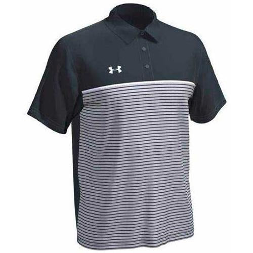Keep things fresh with an embroidery Under Armour Men's Stealth Grey Stripe Mix-Up Polo. This unique polo design has a solid color on the sleeves, collar, and upper chest with stripes along the lower half of the body. The creative look is flattering for most with a loose fit and all day comfort. Add a company logo to use these polos as employee apparel or to use at recruiting events to get noticed. Easily moves from the office with a jacket to a night out with friends or even to the clubhouse for drinks before a round of golf. Place an order today to add to your own wardrobe or to use as gifts.