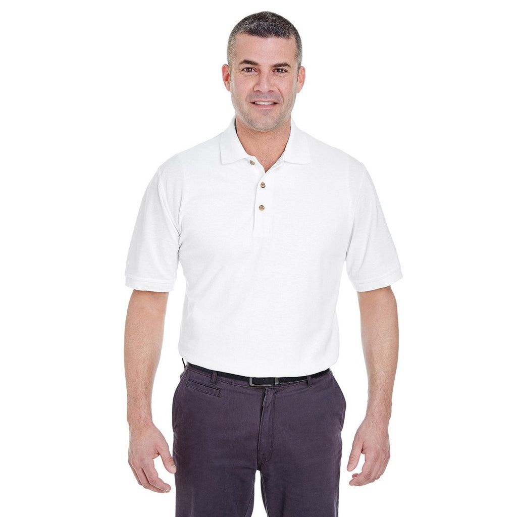 Why do so many clothing designers leave tall people hanging? The UltraClub Men's White Tall Classic Pique Polo takes care of tall men by incorporating plenty of preshrunk 100% cotton pique into the design of the versatile polo. Wear the sleek shirt to work and keep it on after work during happy hour. Wood-tone buttons create enough visual appeal to prompt your professional peers to ask, "Where did you get that shirt." Display the company logo you added to the large imprint area to get the word about your products and services. The relaxed fit conveys a quiet confidence during corporate events.Highlights