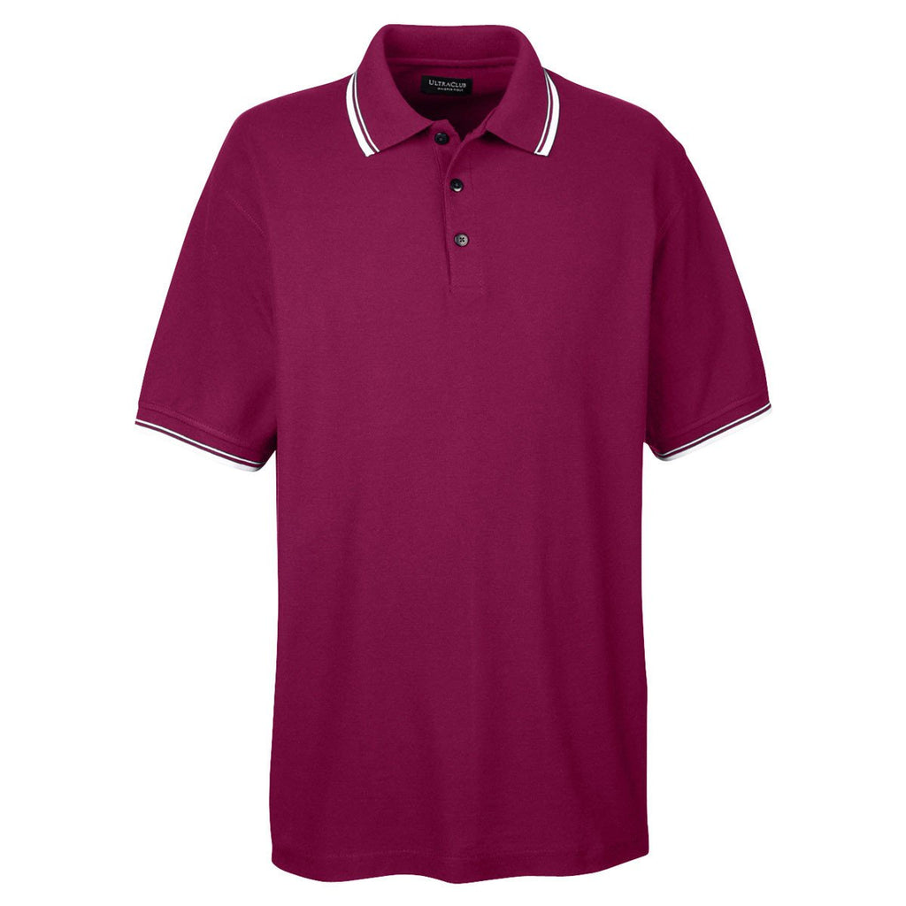 UltraClub Men's Wine/White Short-Sleeve Whisper Pique Polo with Tipped Collar and Cuffs