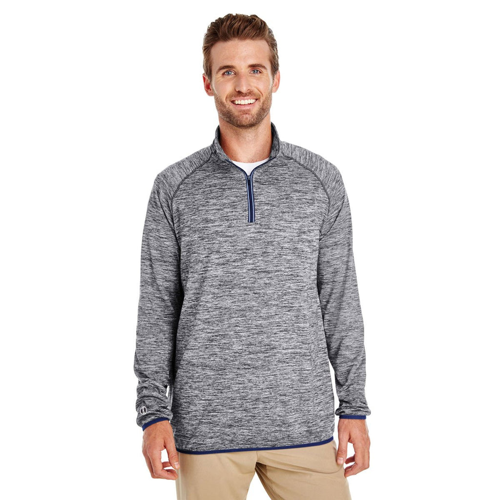 Reflective zipper tape on the embroidered Holloway Men's Carbon Heather/Navy Force Training Top allows you to train at night. Wear the multi-purpose training top when you jog along a road at night or for cycling through fog during the day. Four-way stretch spandex increases your mobility throughout an intense sporting event. Raglan sleeves offer more movement flexibility for the arms, which makes the stylish training top ideal for shearing bushes and reaching tree branches. The quarter-zip neckline ensures your neck receives full protection from the sun's harmful UV rays. Add your corporate logo and watch awareness of your company soar.Corresponding Women's Style:Holloway Women's Carbon Heather/Navy Force Training Top