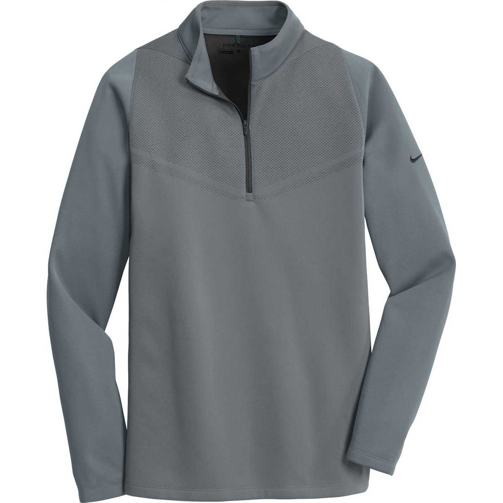 If you want to present a fashionable appearance at the driving range, you can't go wrong by donning the Nike Men's Dark Grey/Black Therma-FIT Hypervis 1/2-Zip Cover-Up. The 100% polyester Therma-FIT fabric regulates the temperature inside of the 1/2-zip jacket. FIT technology quickly removes sweat to create a cooling effect on your skin. The super soft brushed interior feels comfortable on the arms and neck. Design details include open cuffs and a reverse coil zipper. Add your company logo to the 1/2-zip cover-up to increase awareness of your brand at large professional networking events.Corresponding Women's Style:Nike Women's Dark Grey/Black Therma-FIT Hypervis Full-Zip Jacket