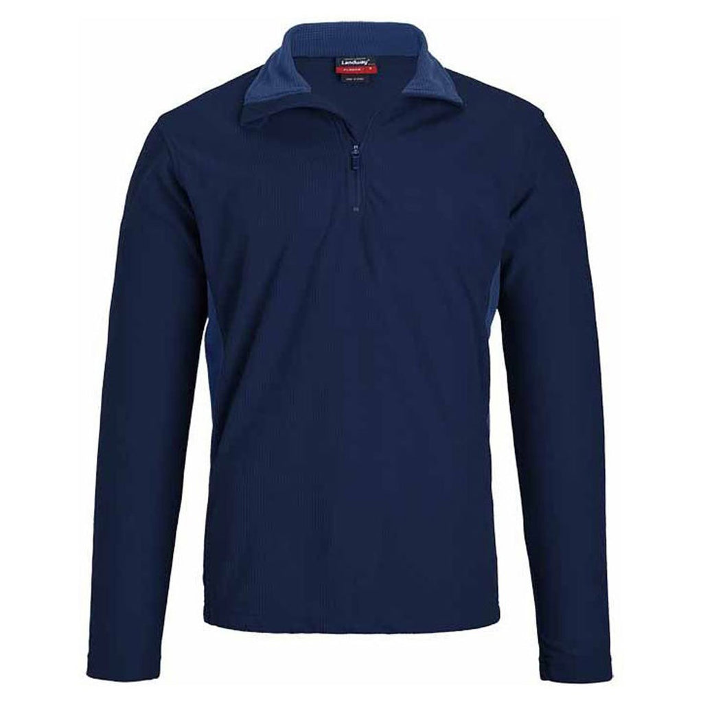 Designed for outdoor enthusiasts, the embroidered Landway Men's Navy/Slate Blue Klamath Waffle-Knit Fleece Pullover includes an inner storm flap to protect you against harsh weather conditions. Lightweight polyester never slows you down when you need to stay ahead of the competition. The stylish two-tone design complements open cuffs to create a classic fit for all occasions. Mini-grid textured micro fleece traps body heat to generate enough warm to keep you comfortable during cold weather trips. Add your company logo on the large imprint area to boost awareness of your brand in the community. Your employees will appreciate receiving a quarter zip that not only looks good but also is comfortable and durable for continuous use.Corresponding Women's Style: Landway Women's Navy/Slate Blue Klamath Waffle-Knit Fleece Pullover