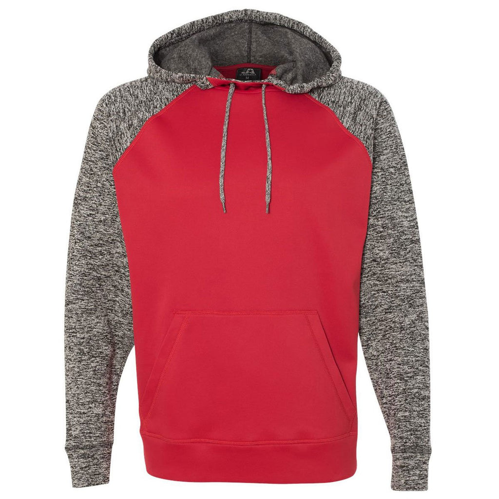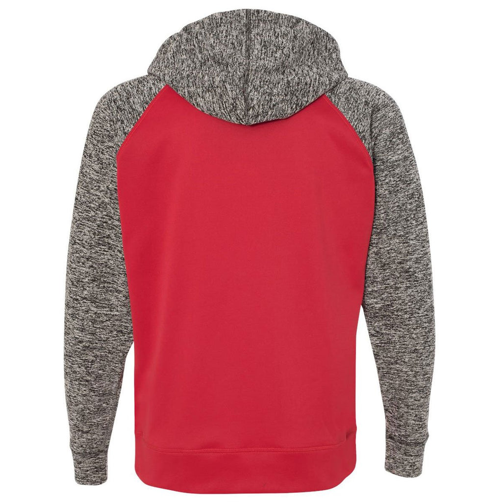 Reach for the marketing cosmos by ordering the screen-printed J. America Men's Red/Charcoal Fleck Colorblock Cosmic Fleece Hooded Pullover Sweatshirt before the next company recruiting event. The versatile pullover sweatshirt comes with an area that allows you to screen print a custom logo. With logoed corporate apparel, you expand the reach of your business in the community. The rugged 100% spun polyester fleece sweatshirt resists rips and tears to deliver years of high-performance fashion use. Use the front pouch pocket to secure the important electronic devices you need to stay in touch with the home office.Highlights