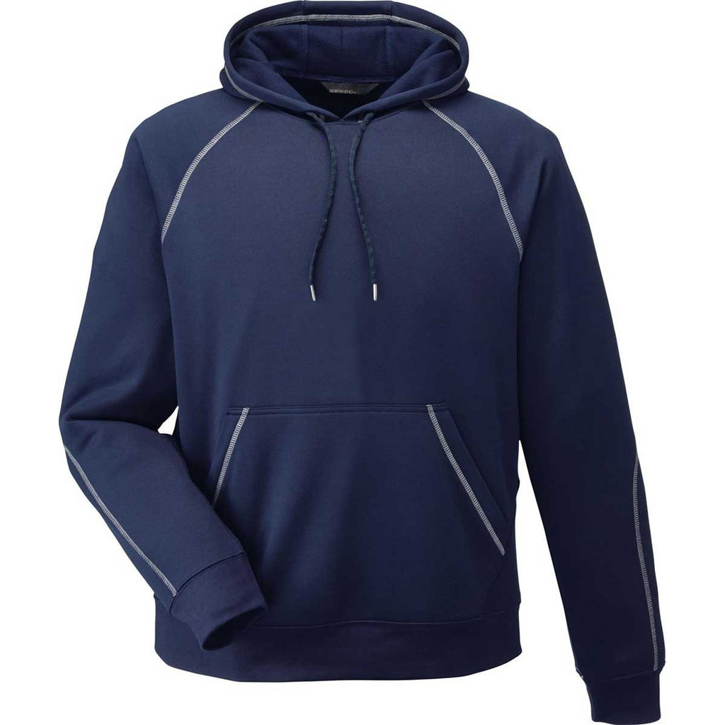 When the temperature drops like a rock, you want a hoodie that offers maximum protection against the onslaught of cold weather. The North End Men's Classic Navy Pivot Performance Fleece Hoodie contains 100% polyester brushed back fleece to protect you against Old Man Winter. Moisture wicking technology ensures you can tighten the draw cord hood and not worry about sweat build up on the skin. Spandex matching waistband and rib cuffs adapt to body shape changes to ensure comfort. Warm your hands in the front pouch pocket that also acts as the perfect storage location for your valuables.Highlights