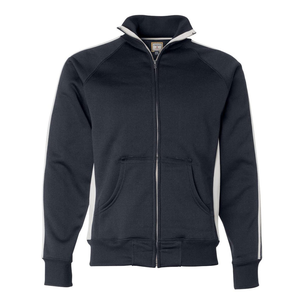 Active professionals looking for comfortable corporate apparel to wear for workouts should order the embroidered J. America Men's Navy/White Vintage Track Jacket . The classic design includes contrast color side gussets and sleeve strips, as well as a split front pouch that allows you to organize electronic devices. Blended cotton and polyester offer the dual benefits of supreme comfort and long lasting durability. Raglan sleeves and rib waist cuffs and collar seal the fashion deal. Attach a custom logo on the large imprint area to create a fashion magnet that attracts potential customers to your company.Highlights