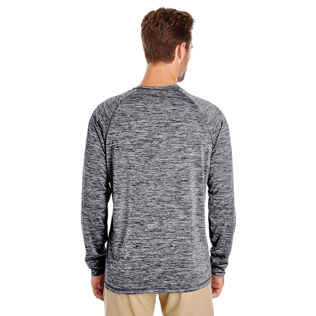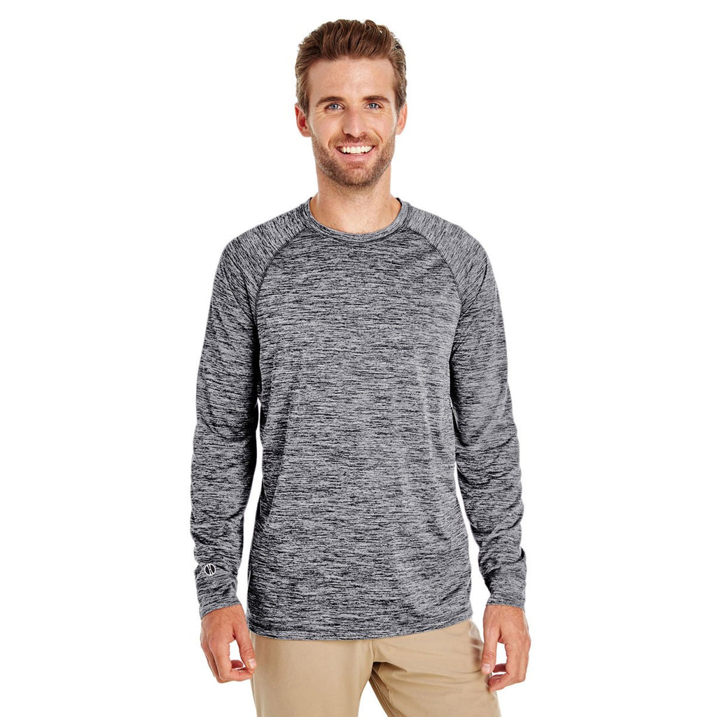 Electrify your professional peers by wearing the decorated Holloway Men's Black Heather Electrify 2.0 Long-Sleeve at the next big corporate event. The versatile long sleeve shirt works as well during a business seminar, as it does during the informal dinner that concludes your busy day. Attach a custom logo on the large imprint area to establish a strong presence for your company. Raglan sleeves improve arm movement flexibility to give you the go to corporate apparel for participating in recreational activities. The visually stunning two-color heather pattern will grab the fashion attention of everyone around you.Corresponding Women's Style: Holloway Women's Black Heather Electrify 2.0 Long-Sleeve