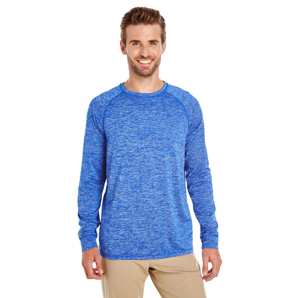 Electrify your professional peers by wearing the decorated Holloway Men's Royal Heather Electrify 2.0 Long-Sleeve at the next big corporate event. The versatile long sleeve shirt works as well during a business seminar, as it does during the informal dinner that concludes your busy day. Attach a custom logo on the large imprint area to establish a strong presence for your company. Raglan sleeves improve arm movement flexibility to give you the go to corporate apparel for participating in recreational activities. The visually stunning two-color heather pattern will grab the fashion attention of everyone around you.Corresponding Women's Style: Holloway Women's Royal Heather Electrify 2.0 Long-Sleeve