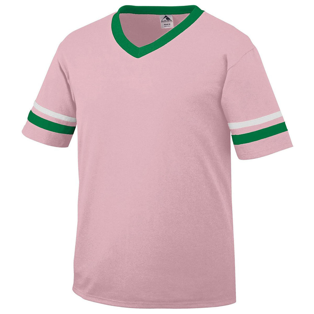 The stylish custom Augusta Sportswear Men's Light Pink/Kelly/White Sleeve Stripe Jersey will look even better with your corporate logo affixed to it. Available in 33 unique colors, the men's jersey includes features such as a 50/50 polyester/cotton jersey knit, contrast color v-neck collar, contrast color sleeve stripes, double-needle hem sleeves and bottom, and other enticing attributes. Add a screen print company logo to the front of this jersey and you have a wonderful way to advertise your company name. This jersey shirt will make a great employee apparel gift or a lovely giveaway item at upcoming golf events or recruiting events.Highlights