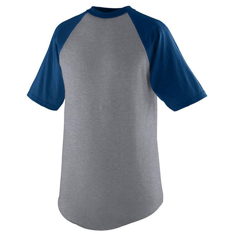 Attach your company logo to Augusta Sportswear Men's Athletic Heather/Navy Short-Sleeve Baseball Jersey for a stylish shirt, perfect for a day at the park or as employee apparel for the company softball team. Available in 16 different colors, choose the right color tone to match your company logo. Features of this must-have clothing item include a comfortable 50/50 cotton/polyester jersey knit fabric, contrasting color sleeves, double-needle hem sleeves, and fishtail bottom. Purchase this shirt as corporate apparel and add your screen print company logo to the front of the shirt for the perfect finishing touch.