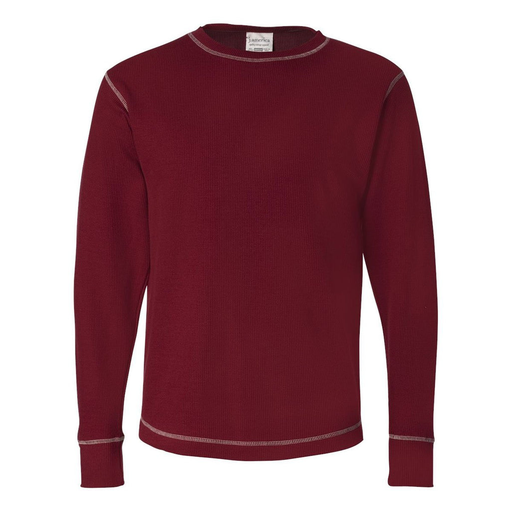 One-hundred percent cotton fabric designed for the company logoed J. America Men's Simply Red/Vintage White Vintage Long Sleeve Thermal T-Shirt feels super soft on the skin. The cotton fabric resists rips and tears to give you years of fashionable high performance use. Contrast color flat lock stitching enhances the appearance of the J. America corporate apparel. The contoured bottom hem presents a refined look that helps you settle into weeklong business seminars. Attach a custom logo on the t-shirt to turn the potential customers you meet into lifelong patrons of your business. Wear the versatile long sleeve t-shirt to work and keep it on afterwards when you dine at your favorite restaurant.Highlights