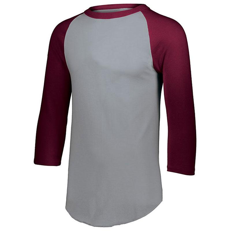 The custom Augusta Sportswear Men's Athletic Heather/Maroon 3/4-Sleeve Baseball Jersey comes in 16 different colors, ideal for finding the perfect color tone to complement your company logo. This 3/4-length sleeve shirt is made of a comfortable 50/50 cotton/polyester jersey knit fabric and consists of enticing additional features, such as a contrast color rib knit collar, tear away label, contrast color sleeves, double-needle hem sleeves, fishtail bottom, and more. Add your screen print company logo and purchase this corporate apparel for your company softball team or as a gift to employees for a job well done at the office.