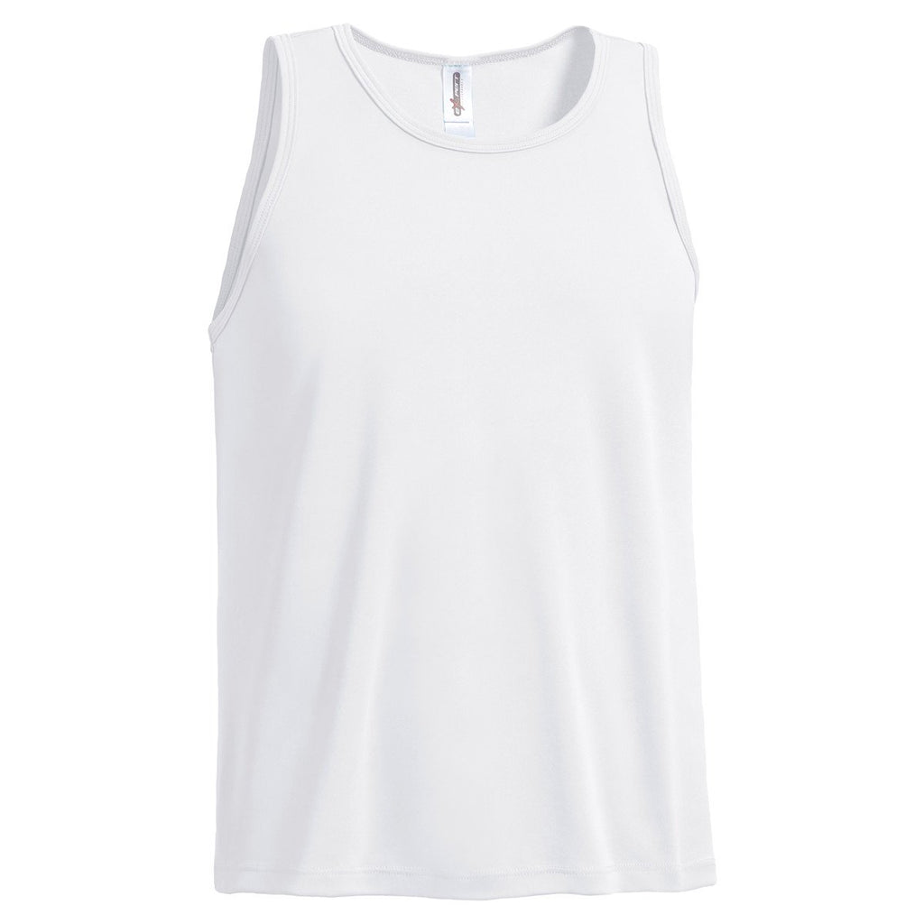Move freely and comfortably in any workout program with Expert Men's White Workout Tech tank top featuring breathable mesh for letting out excess heat for cool comfort while working out. Offset side seams minimize the chances of chafing and irritation while athletic fit ensures freedom of movement during workout regimen. Crafted from 100% microfiber polyester px maX. The fabric is BodyFreshe anti-bacterial technology and wicks sweat quickly. Flaunt your brand pride with this men's performance tank top! Our advanced customization service lets you customize this top with ultra-fine quality logo imprint of your company.Highlights