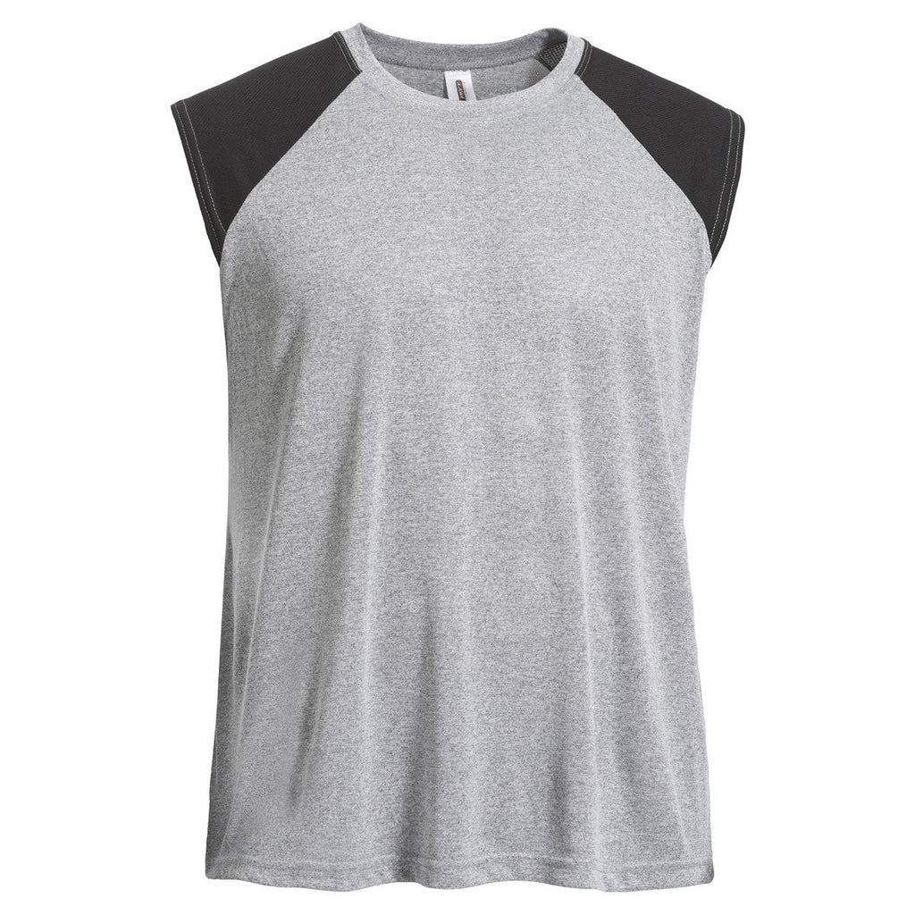 Turn heads without even making a move in this Expert Men's Heather Grey/Black Sleeveless Colorblock Natural Feel Training Tee. Contrast oXymesh shoulder panels lend it a preppy vibe while still maintaining its masculinity. It's made of cotton like microfiber poly jersey that with wicking properties that will deflect any sweat that develops as you workout. Treated with BodyFreshe antibacterial technology to ward of odor. A versatile option for companies looking for custom logo tees made with an active lifestyle in mind.Highlights