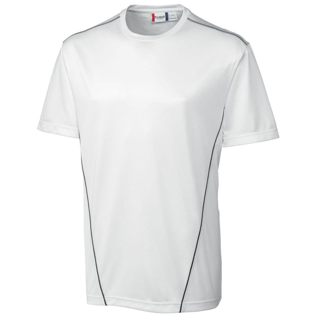 For company apparel the men on your corporate team can wear in the field and on a softball diamond, order the chic Clique Men's White Ice Sport Tee. The mold breaking design of the tee includes contrast piping details and double layer neck trim. Open sleeves give you the advantage when swinging a bat or a driver from golf tee boxes. Pieced shoulders present a symmetrical appearance that makes your company team stand out for all the right fashion reasons. Screen print a custom logo to increase awareness for your brand at professional networking events.