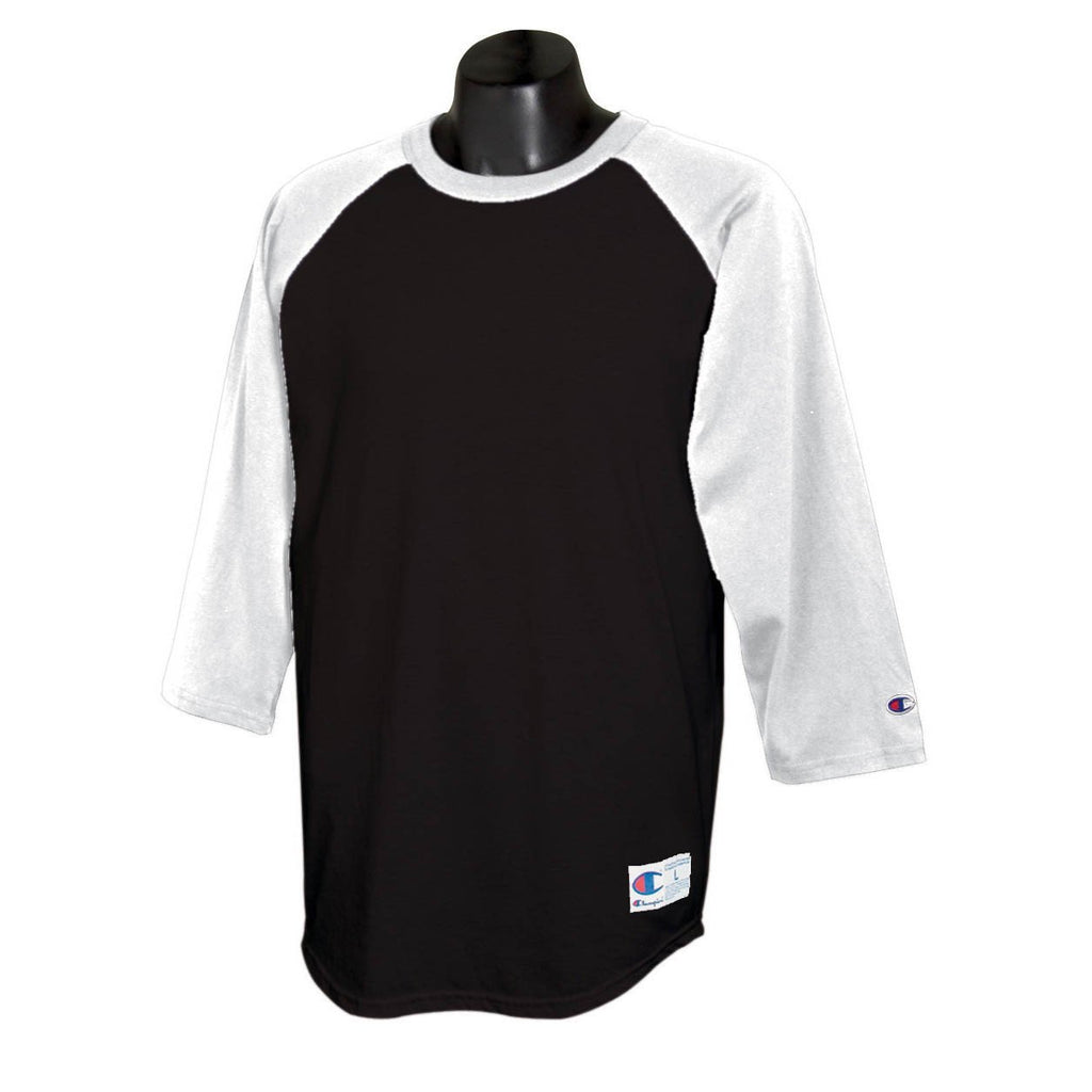 Want a T-shirt that will never go out of style? The classic design of the Champion Men's Black/White Baseball T-Shirt is comfortable and durable enough to wear all the time--and casual enough that you just might get away with doing exactly that. The Champion Men's Black/White Baseball T-Shirt is extremely lightweight and breathable.?Made with 100% cotton, it has 3/4 length sleeves, double-needle stitching on the sleeves and bottom hem, and a logo on the left sleeve.Highlights