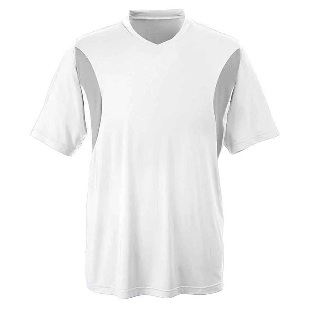 Whether you play in soccer league or just need a jersey to participate in a basketball pick-up game, the Team 365 Men's White Short-Sleeve Athletic V-Neck Tournament Jersey is the right jersey for you. The mostly polyester jersey includes enough spandex to give you the movement flexibility you need to out maneuver the competition. Cationic dyes produce a superior bright design that attracts the attention of everyone who attends the big game. Take advantage of the attention by adding a custom logo that potential customers remember. Moisture wicking technology quickly removes perspiration to cool the skin.Corresponding Women's Style: Team 365 Women's White Short-Sleeve Athletic V-Neck Tournament Jersey