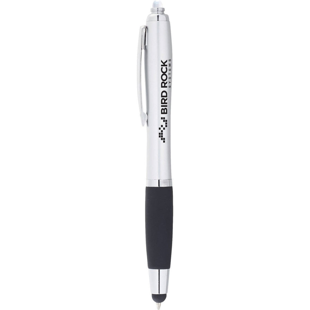 James Bond would be proud to own the Scripto Silver Score 3-in-1 Ballpoint Stylus Light. Not only does the writing instrument include the patented Scripto stylus and ballpoint pen, it also contains a click function LED light that sends bright targeted light into any direction. The rubber stylus goes easy on sensitive touchscreens and the ballpoint pen dispenses ink that never runs across paper. Scripto designed the multi-purpose writing instrument specifically for iPad use. Double wall plastic absorbs the strongest impacts caused by drops to the ground. Attach a custom logo to promote your company at civic events.