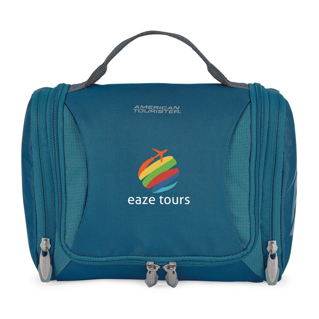 Traveling isn't always a breeze. Sometimes you need a little bit of help. Look no further than the American Tourister Tidal Blue Voyager Amenity Case to make any journey easier. It comes outfitted with a built in hook to allow you to hang it up for easy access to your travel essentials. As well as dual zippered mesh compartments for storing toiletries to help make anywhere you may travel feel a little bit like home. Now all you need to do is add your custom logo to this travel companion to take your brand to the next level. The minimum order for this product is 12 pieces when decorated.