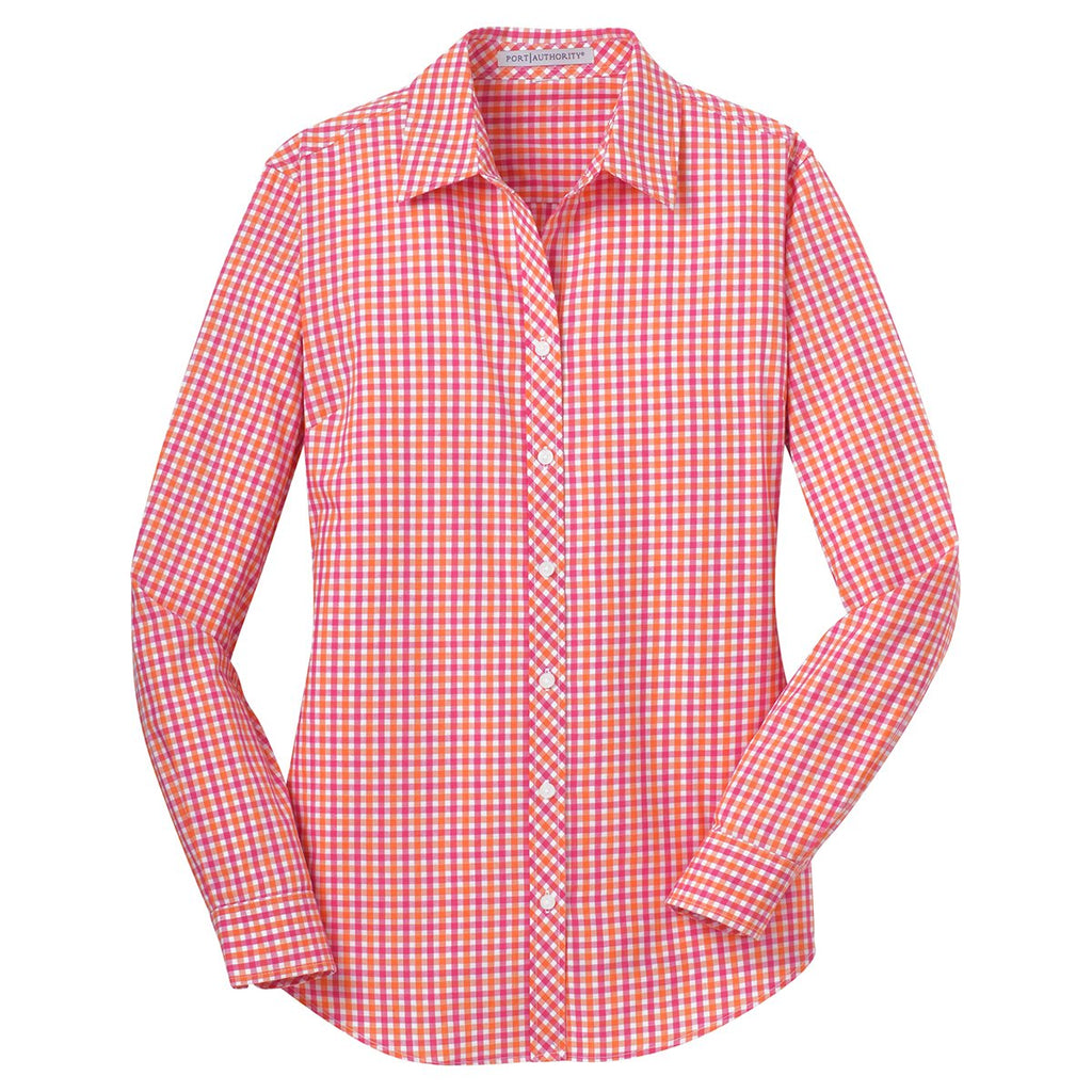 If you were putting together a recipe for a stylish and modern dress shirt, it wouldn't be too complicated. It would probably look like Port Authority Women's Tangerine/Pink Long Sleeve Gingham Easy Care Shirt. Make sure the colors suit your style or brand and voila: you've got custom apparel that suits your sense of style. But there is one missing ingredient we can recommend: your embroidered company logo.Highlights