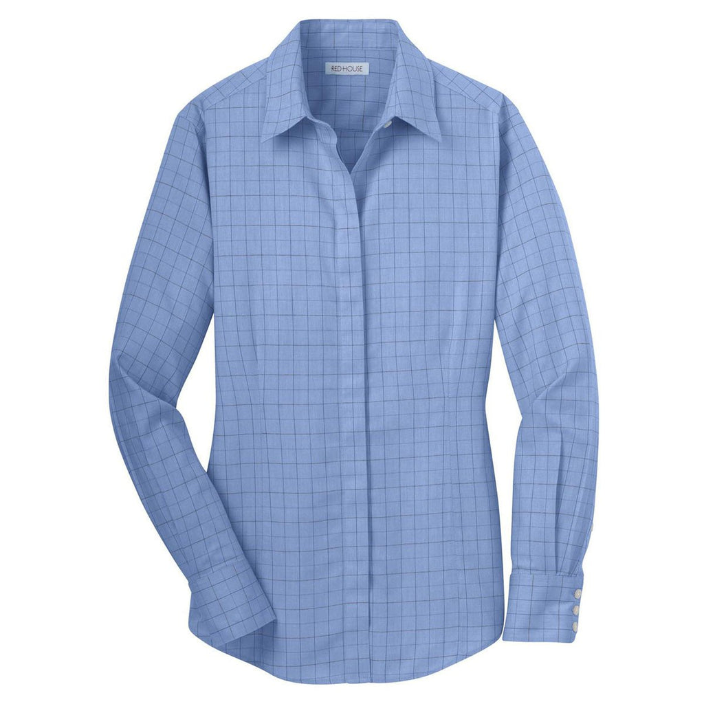 Women like to wear fashionable shirts with corporate logos, so why not offer this Red House Women's Blue Windowpane Plaid Non-Iron Shirt. Not only are the colors chic, the design is quite feminine. It features an open collar, covered button-front placket for a seamless look, front and back darts, and three-button notched cuffs. The special finish on the cotton fabric keeps it looking crisp all through the day. The windowpane shirts has pucker-free single needle tailoring, Red House engraved buttons, and monogram on right sleeve placket. Sizes available are XS to 4XL. Choose your favorite windowpane color from blue, dove grey, and thistle purple.Corresponding Men's Style: Red House Men's Blue Windowpane Plaid Non-Iron Shirt