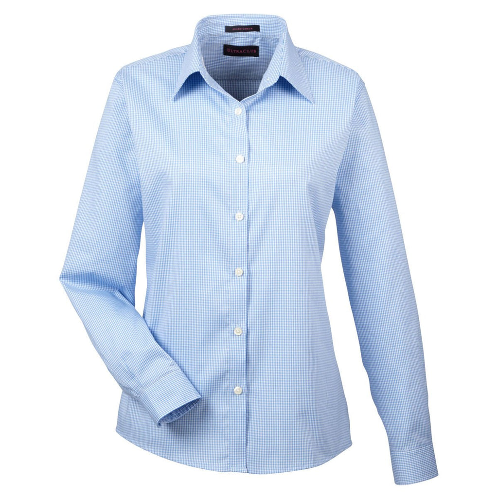 UltraClub Women's Light Blue Yarn-Dyed Micro-Check Woven
