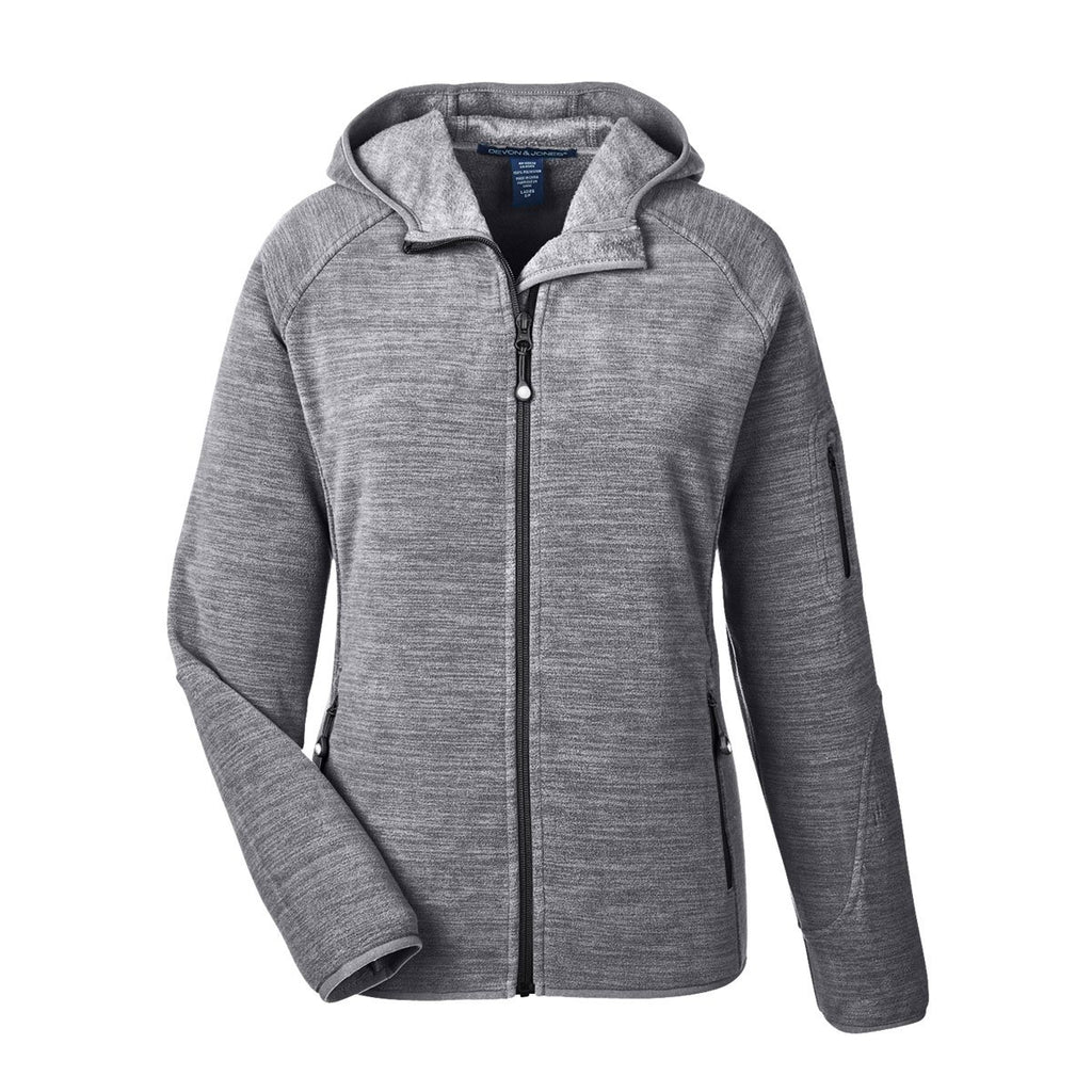 Gear up to battle against the harsh elements in style and comfort with the ultra-soft fleece of Devon & Jones Women's Dark Grey Heather Perfect Fit Melange Velvet Fleece Hooded Full-Zip. Crafted from 100% polyester anti-pill melange velvet fleece. Features include storm placket, front reverse coil zipper, attached hood, lower pockets and left arm pocket with zippers, stretch binding on sleeves, hood, and hem. Accomplish brand recognition and corporate identity by customizing this fleece full-zip hoodie with your company's logo for your workforce, giveaways to clients, or as a gift to potential clients.