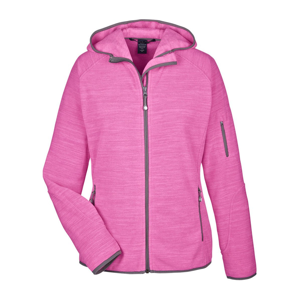 Gear up to battle against the harsh elements in style and comfort with the ultra-soft fleece of Devon & Jones Women's Charity Pink Heather Perfect Fit Melange Velvet Fleece Hooded Full-Zip. Crafted from 100% polyester anti-pill melange velvet fleece. Features include storm placket, front reverse coil zipper, attached hood, lower pockets and left arm pocket with zippers, stretch binding on sleeves, hood, and hem. Accomplish brand recognition and corporate identity by customizing this fleece full-zip hoodie with your company's logo for your workforce, giveaways to clients, or as a gift to potential clients.