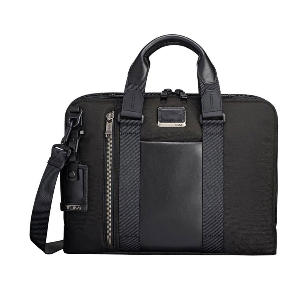 Put your brand in their hands and on the go with your company's custom logo on the TUMI Black Bravo Aviano Slim Brief. Crafted in a slim profile, it boasts dedicated laptop and iPad compartments. Ballistic nylon construction protects contents from moisture, shocks and scratches. Makes a versatile promotional item that's ideal for almost any audience, event, or occasion.