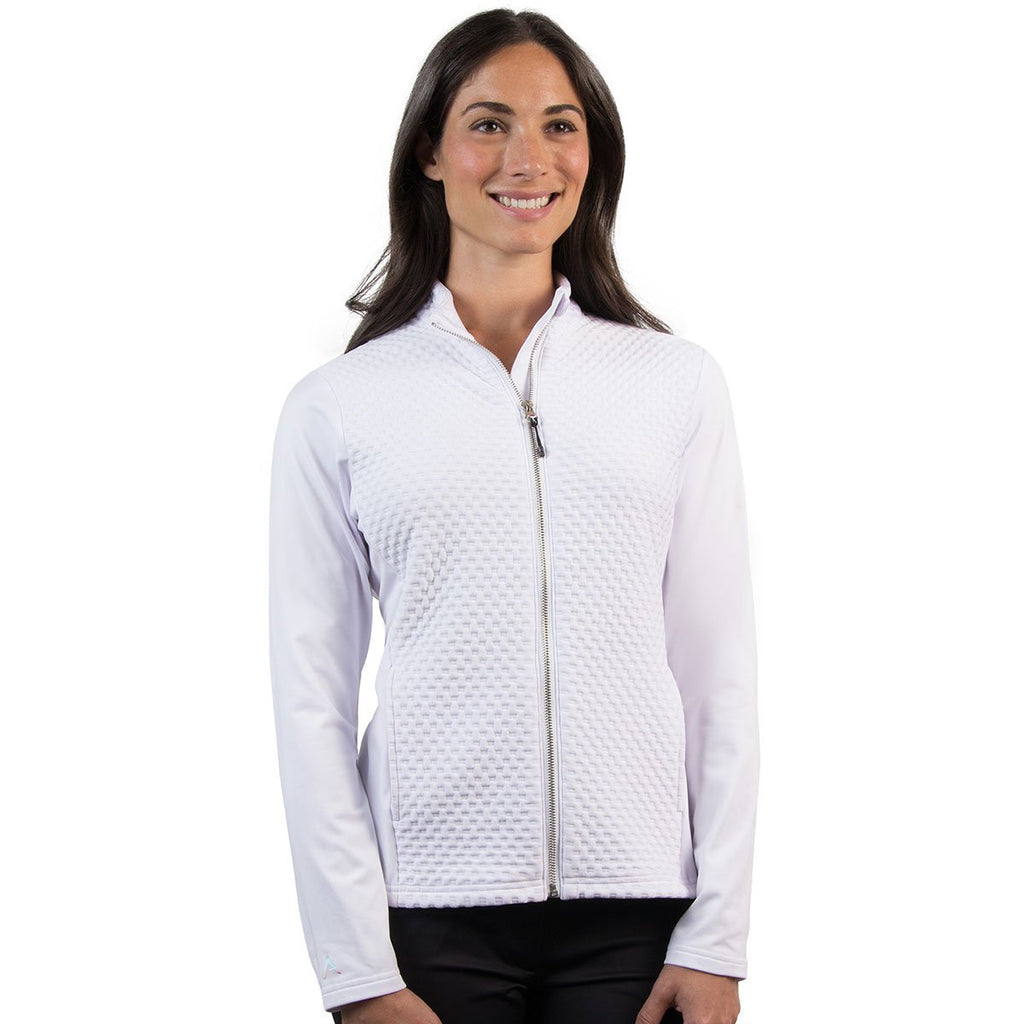 Feel relaxed and comfortable while keeping professional standards in the Antigua Women's White Getaway. Available in seven beautiful colors, this custom embroidery full zip jacket offers a double knit heather jacquard pattern with cut and sew princess seams and hip pockets in a variety of sizes. Perfect for a golf event on a cooler day or to use as employee apparel with a company logo for daily wear, this jacket will be a fast favorite. The full zip style makes for a comfortable fit whether your day is spent at a trade show or recruiting event. Pair with your favorite custom shirt for a look that easily goes from the boardroom to the greens. Place your order today.Corresponding Men's Style: Antigua Men's White Getaway