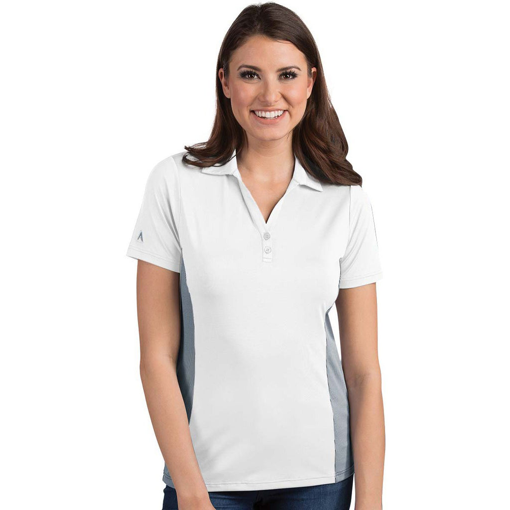 The custom Antigua Women's White/Steel Venture Polo is available in nine unique color schemes and offers a wealth of features. Some of the features which you'll enjoy with this embroidery logo dual color polo shirt include a 100% polyester fabric, Desert Dry moisture wicking capabilities, solid front panel and sleeves, two-button "Y" placket with open cuff, solid self-fabric collar, and unique Antigua patch on right sleeve. When you add your company logo to the shirt, you have a wonderful giveaway gift for golf events, trade shows, and recruiting events.Corresponding Men's Style: Antigua Men's White/Steel Venture Polo