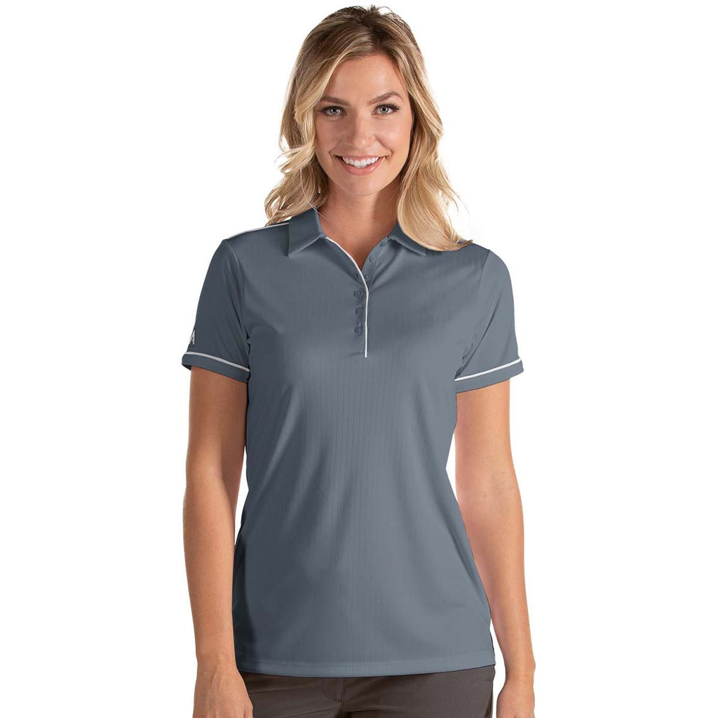 The logoed Antigua Women's Steel/White Salute Polo offers style and classic fit in one luxurious women's polo shirt. This embroidery corporate apparel item is available in seven eye-catching colors and contains features such as 100% polyester fabric material, five-button closure, self-fabric collar with open cuff, Antigua triangle patch on the right sleeve, and contrast tipping on the placket, shoulder, and cuff seam. With your company logo added to the shirt, you have an excellent gift to distribute to your loyal team as employee apparel or hand out at upcoming trade shows or recruiting events. Not only does it display your company name for advertising purposes, but it is also a welcome gift for all who receive it.Corresponding Men's Style: Antigua Men's Steel/White Salute Polo
