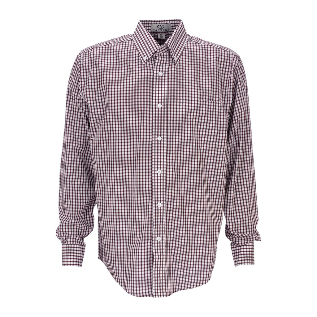 Enjoy care free fashion by ordering the company logoed Vantage Men's Deep Maroon/White Easy-Care Gingham Check Shirt. The pure cotton fabric allows you to wear the stylish corporate apparel as an only shirt during the warmer months of the year and as the second layer to keep you warm when Old Man Winter comes a calling. Rugged polyester strengthens the cotton to produce a rip and tear resistant shirt. Wear the shirt at the office and keep it on during a professional networking event at night. Add a custom logo on the large imprint area to promote your products among your professional peers.Highlights