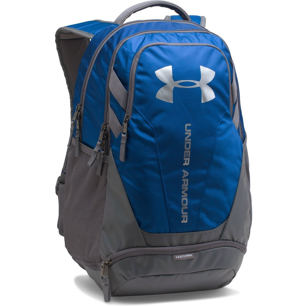 Hustle through congested airports by carrying the Under Armour Royal/Graphite UA Hustle 3.0 backpack. The large, gusseted front pocket makes the perfect storage unit for shoes and the laundry you need to clean for the next business meeting. Adjustable HeadGear shoulder straps ensure you move through airport terminals with heavy loads balanced on your back. Grab the top handle to place the durable backpack inside of an airplane storage compartment. Under Armour Storm technology protects your business accessories against long exposure to wet weather conditions.Highlights