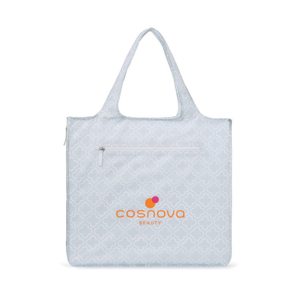 Showcase your company name or promotional logo for your marketing message on this Gemline Light Grey Moroccan Pattern Riley Large Patterned Tote. Allowing you to carry more of your personal belongings while away, this packable tote can be packed into its side gusset zippered pocket for ultimate on-the-go convenience. Highlights include a main compartment with zippered closure, interior accessory pocket and a front zippered pocket. Great promo option for outdoor, sports, and many other events.