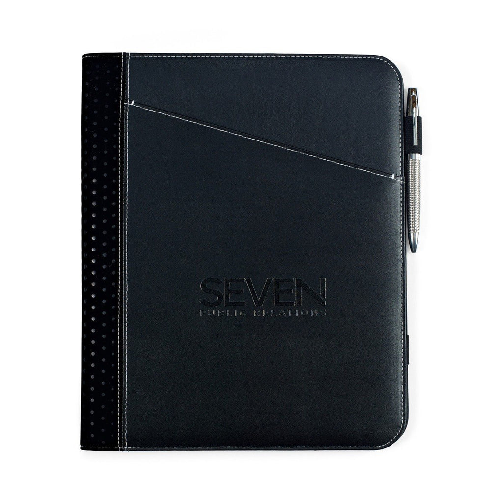 Contemporary styling highlights the design features of the Gemline Black Cedar Leather Writing Pad. Use the mesh pocket to secure electronic devices such as a smartphone up to the size of an iPhone 6. The exterior pen loop keeps your favorite writing instrument within quick access for taking impromptu notes during a business lecture. Enjoy the interior multiple purpose organizer that offers storage space for flash drives business cards, as well SD and SIM cards. The writing pad comes with 8.5" by 11" size paper that provides enough paper to get you through the workday. Add a custom logo to spread the word about your business.